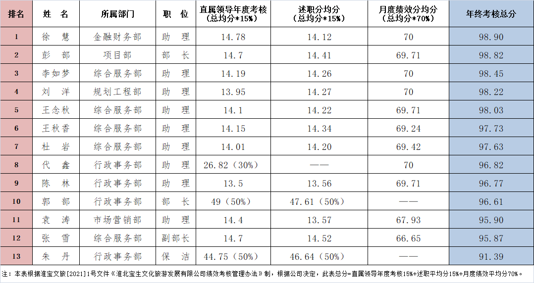 注:本表根據(jù)淮寶文旅[2021]1號文件《淮北寶生文化旅游發(fā)展有限公司績效考核管理辦法》制,根據(jù)公司決定,此表總分=直屬領(lǐng)導(dǎo)年度考核15%+述職平均分15%+月度績效平均分70%。